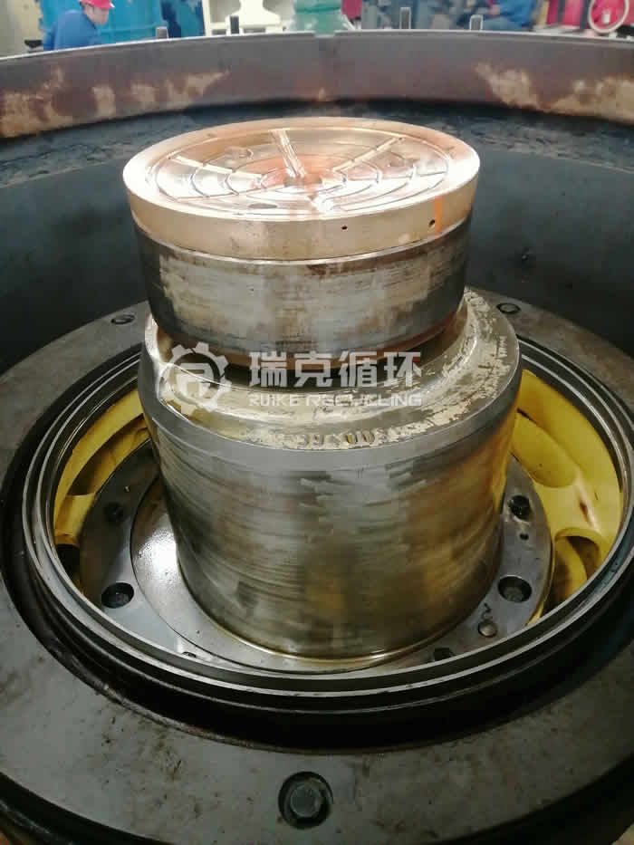 因动锥和定锥衬板磨损严重,需更换全新衬板。更换检查动定锥衬板时发现定锥衬板与上架体结合度,有轻微瑕疵,经公司处理后达到验收合格标准。更换动锥新衬板的同时,添加衬板与架体之间的背衬胶。更换新的切割环,锁紧螺母,压帽。